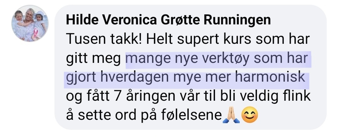 «Kurset var veldig bra, helt fantastisk! Jeg lærte mye jeg har visst, men ikke evnet å formidle på den rette måten. Kurset burde vært pensum for foreldre.»