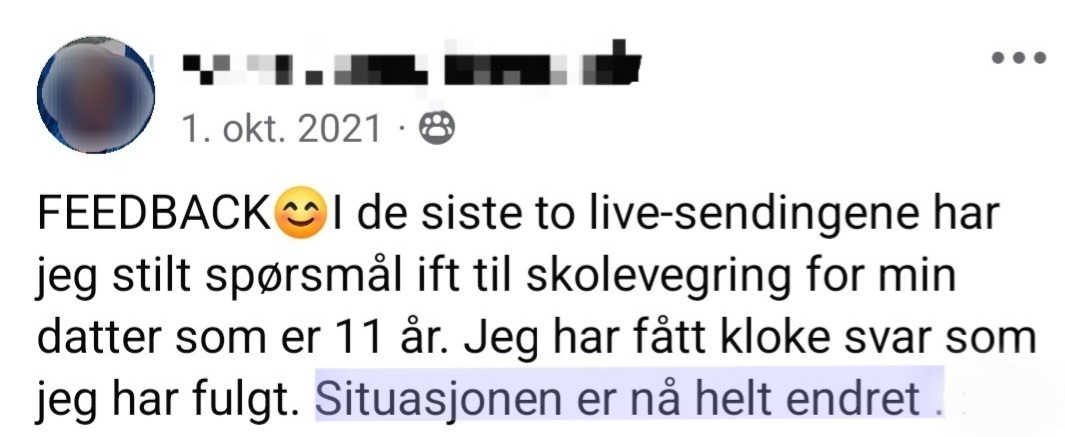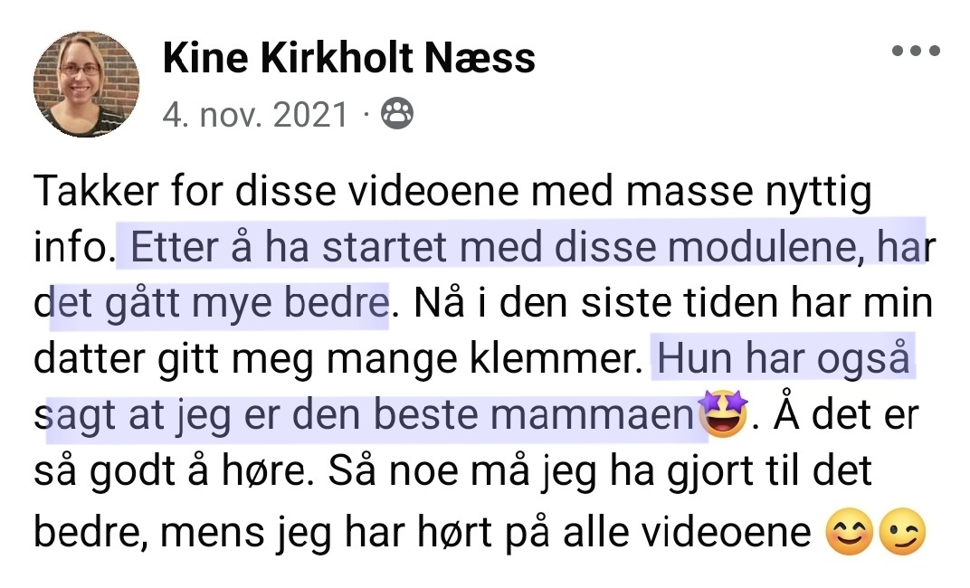 «Jeg er tryggere i foreldrerollen og mer motivert for å møte problemet. Du formidler så godt og alt blir så logisk når du forklarer og forteller. Du bryr deg virkelig, samfunnet trenger mange flere sånne som deg!»